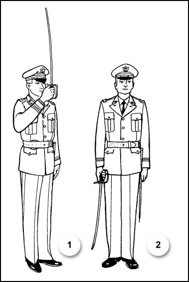 (2) Present Saber (Sword) may be executed from the carry when serving in the capacity of commander of troops or serving in a command that is not part of a larger unit. On the preparatory command of Present, the saber (sword) is brought to a position (at the rate, of two counts) approximately four inches from the nose so that the tip of the saber (sword) is six inches from the vertical (1, Figure F-5). At the command of execution ARMS, the right hand is lowered (at the rate of two counts) with the flat of the blade upward, the thumb extended on the left side of the grip (2, Figure F-5), and the tip of the saber (sword) about six inches from the marching surface.