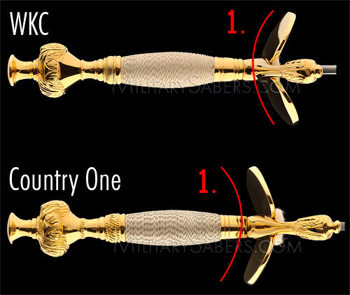 The most obvious difference between the two swords is the orientation of the guard, or what we often call the “butterfly piece.” Historically during the 1800’s, this piece was most commonly flat or oriented forward (like WKC’s), but some antique models have the orientation to the rear like Country One shows. Today, however, the standard is to orient the guard forward, a convention the Old Guard has practiced for years. This difference has a simple solution and is not catastrophic – simply take the hilt apart and reorient the piece – but one must ask how well Country One knows its customer and specifications.
